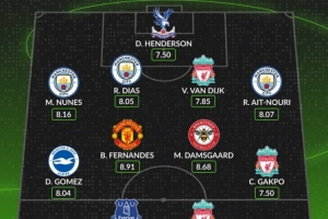 Whoscored评本轮英超最佳阵:B费领衔,埃基蒂克、迪亚斯在列