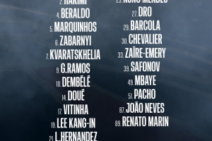 前锋:7-克瓦拉茨赫利亚、9-贡萨洛·拉莫斯、10-登贝莱、14-杜埃、29-巴尔科拉、49-姆巴耶